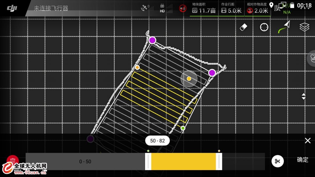 拖动下方黄色区两端可选择需要作业的区域,从左端往右滑动则从起始点减少航线数,从右端往左滑动则从结束点减少航线数。